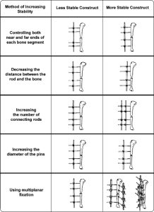 مهم‌ترین چالش در طراحی فیکساتور، تقسیم نیرو به صورت متعادل و باثبات بین میله‌ها و پین‌ها میباشد که با استفاده از قوانین فیزیکی طراحی می‌گردد. در جدل زیر نشان داده شده است که چطور فاصله میخ‌ها از هم و از استخوان و همینطور سایز پین‌ها و تعداد دستگاه‌های استفاده شده میتواند ثبات دستگاه را بهم زده یا آنرا بهبود یابد. همینطور استفاده از متریال مناسب که بتواند وزن فرد را تحمل کند و فشار نیروهای ناشی از حرکت آنرا خراب نکند مسئله بسیار مهمی است.