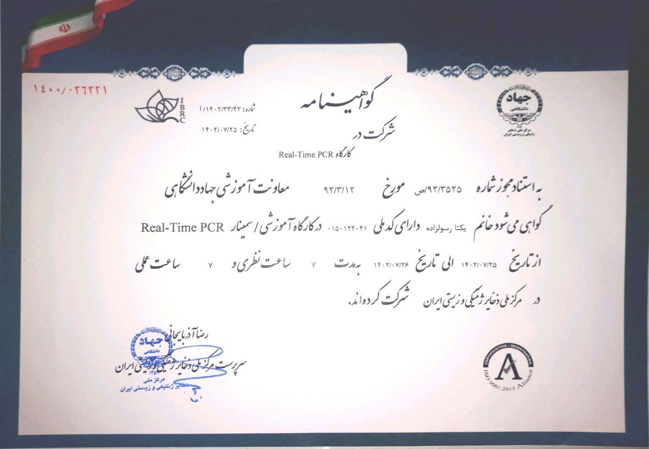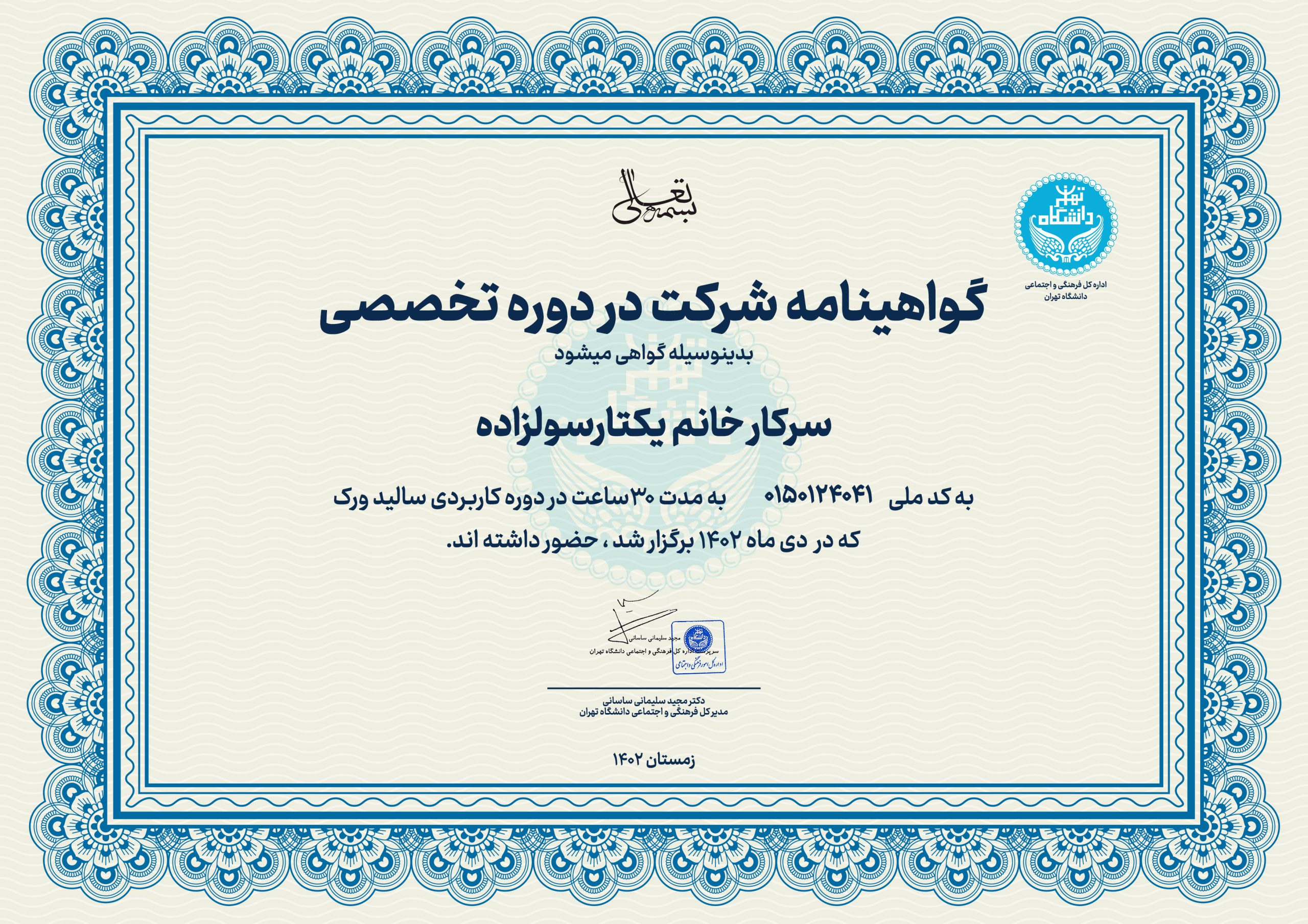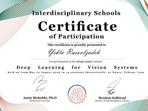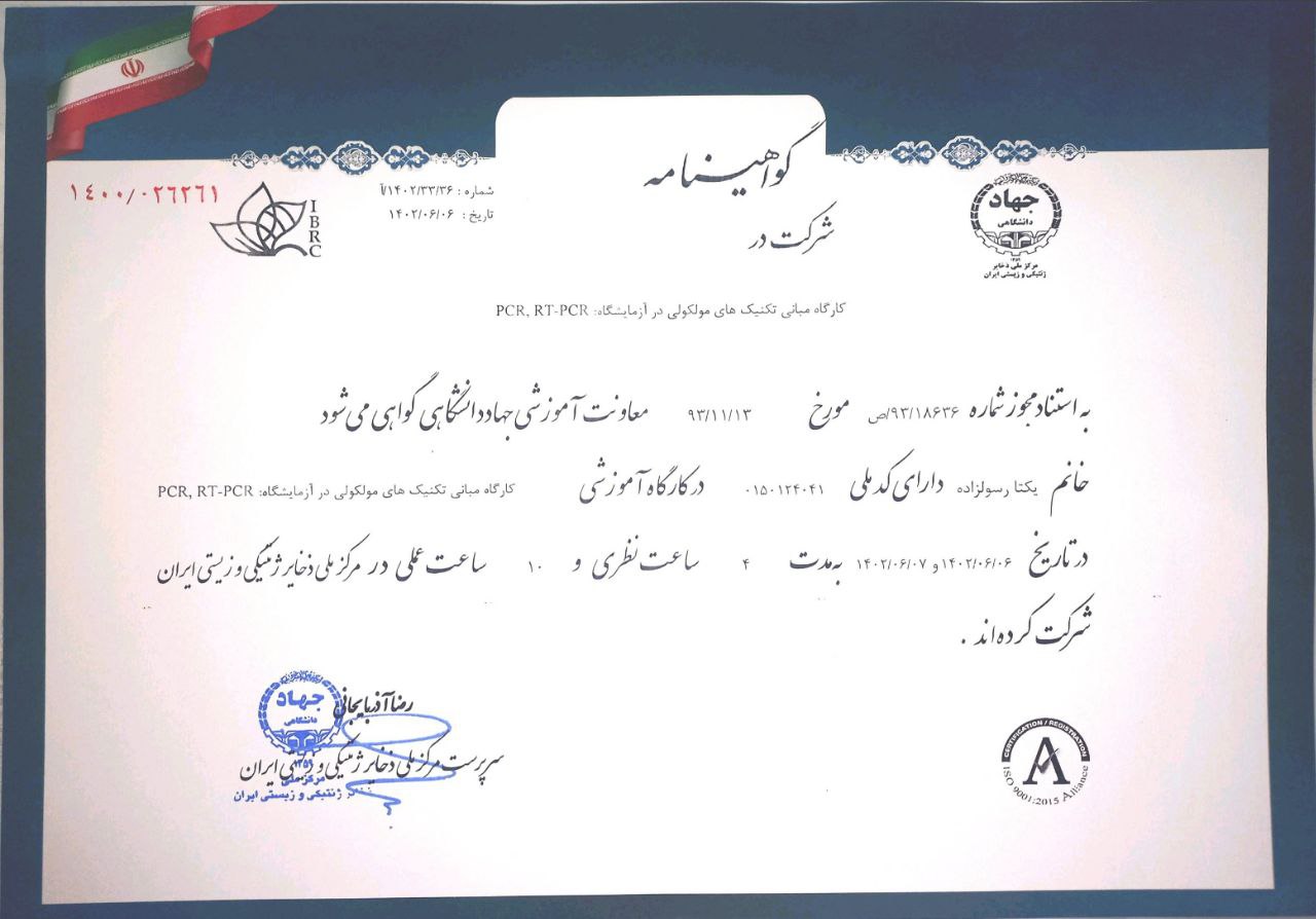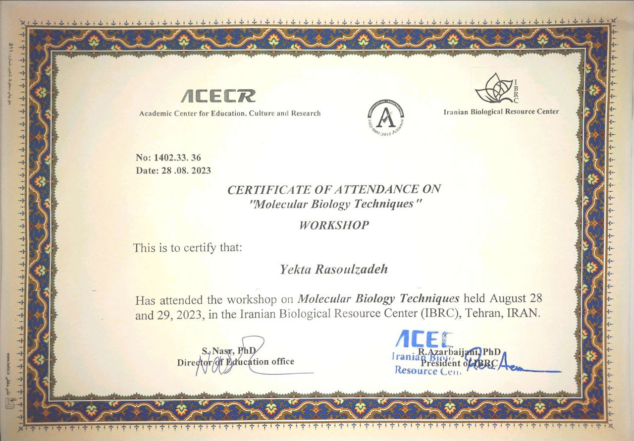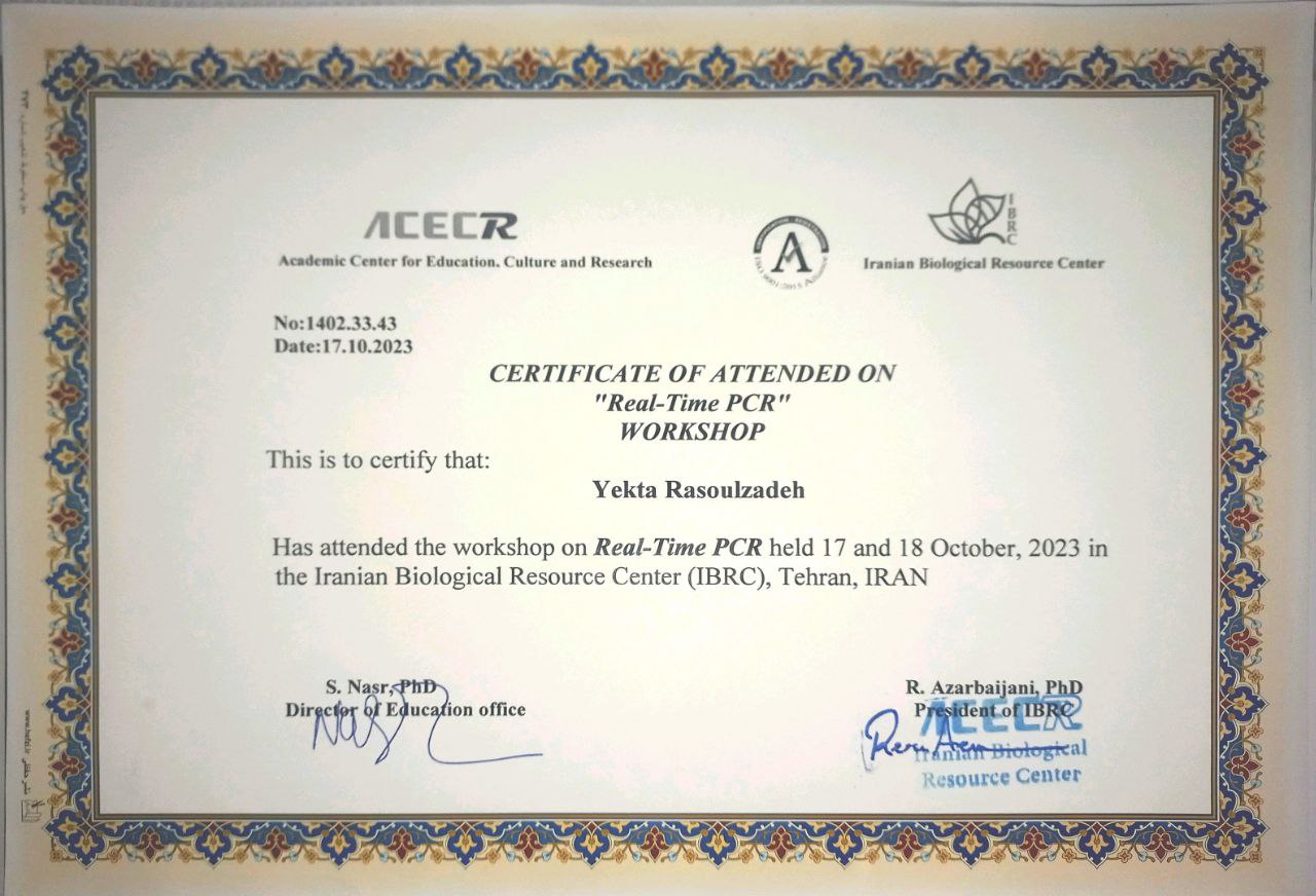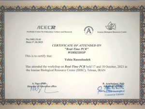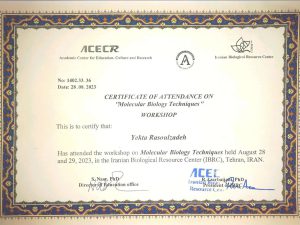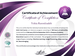 کارآموزی به مدت 194 ساعت در پژوهشکده سرطان پستان معتمد در دو بخش بیوانفورماتیک و اجرای پروژه هوش مصنوعی روی اطلاعات آماری بیماران و بخش میکروفلوئیدیک دپارتمان علوم نوبنیاد.