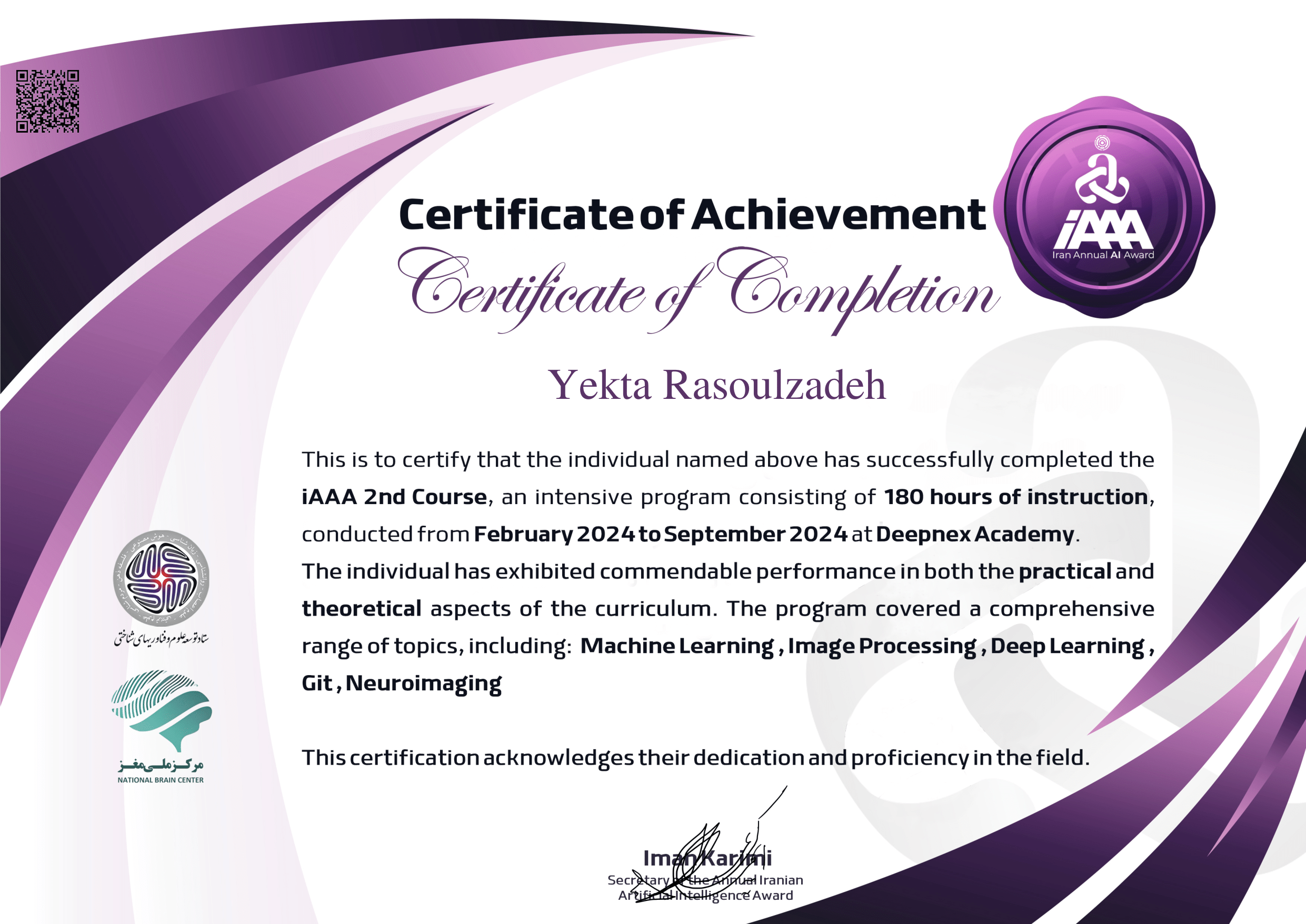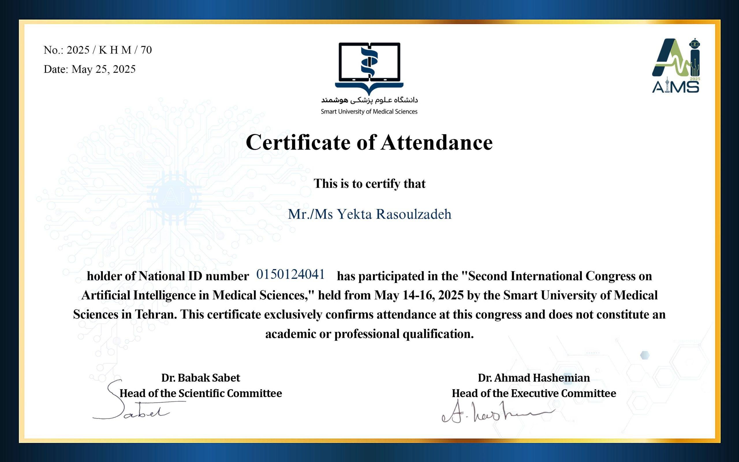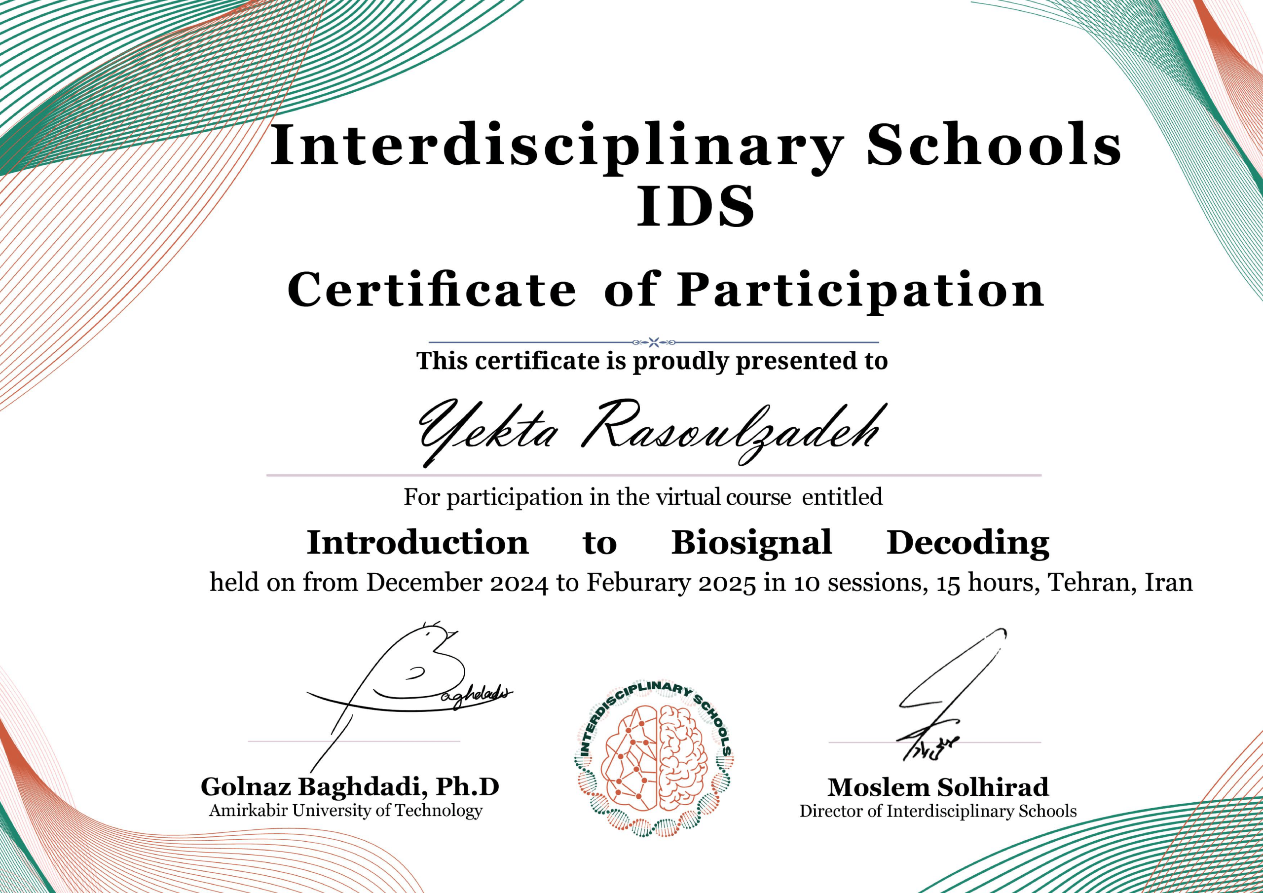 دانشجوی کارشناسی ارشد مهندسی پزشکی گرایش بیوالکتریک مسلط به برنامه نویسی ++c و پایتون، و رتبه اول طرح مسئله محور شهید بابایی سازمان نخبگان