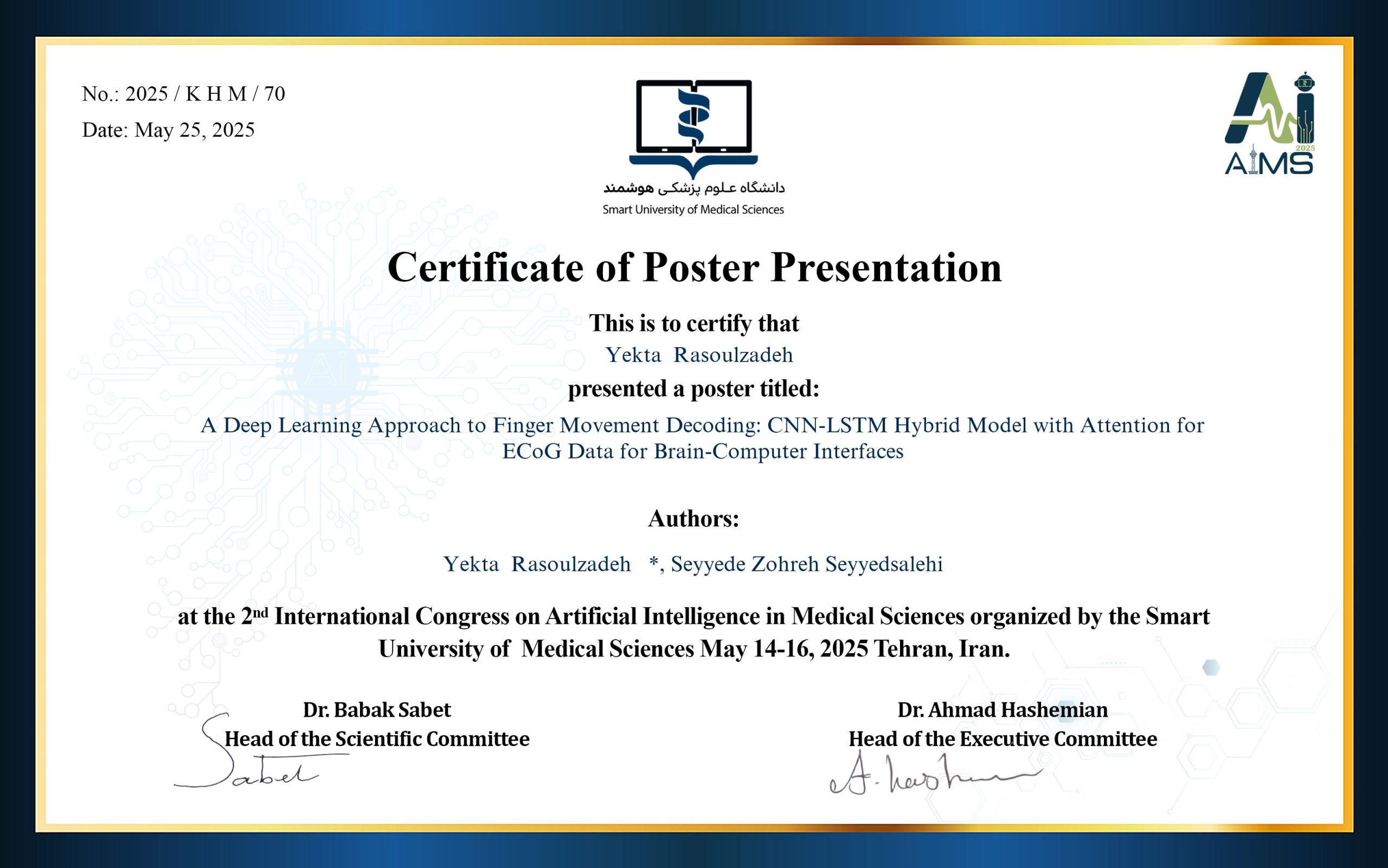 Y. Rasoulzadeh and S.Z. Seyyedsalehi, “A Deep Learning Approach to Finger Movement Decoding: CNN-LSTM Hybrid Model with Attention for ECoG Data for Brain-Computer Interfaces”, AIMS 2025.
